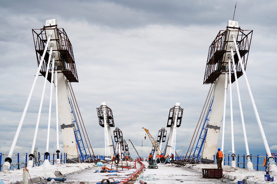 中俄合建的首座跨境公路大橋——黑河到布拉戈維申斯克黑龍江(阿穆爾河)大橋進入橋面鋪裝施工作業階段。(記者 王建威 攝)
