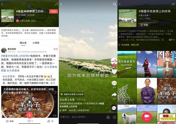 “山貨上頭條”是基于今日頭條等產(chǎn)品發(fā)起的扶貧項(xiàng)目,為了讓內(nèi)蒙古特色更好地走出去,項(xiàng)目組為當(dāng)?shù)卮_定了“錫林郭勒羊,來自大草原的珍珠”的品牌傳播定位,邀請(qǐng)專業(yè)內(nèi)容制作團(tuán)隊(duì)、平臺(tái)優(yōu)質(zhì)內(nèi)容創(chuàng)作者以圖文、短視頻等方式,展示羊肉產(chǎn)品特點(diǎn)、草原生態(tài)環(huán)境等,并帶動(dòng)平臺(tái)用戶共同傳播推廣,從而提升錫林郭勒羊肉產(chǎn)品品牌認(rèn)知度。
