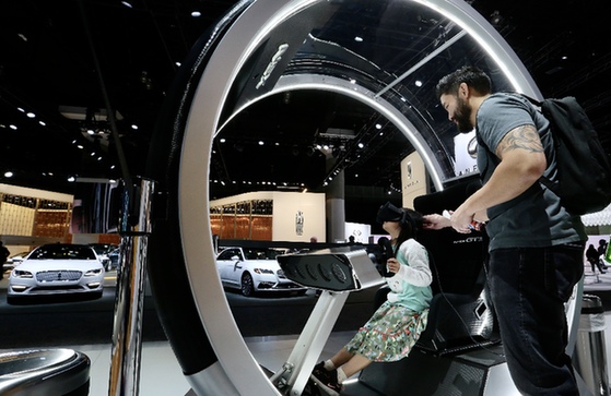 11月22日,在美國2019年洛杉磯車展上,一名小女孩通過VR虛擬現實技術體驗汽車駕駛。新華社發