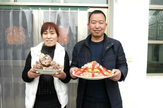 脫貧村里看“年景”。甘肅省定西市岷縣中寨鎮馬崖村村民趙成義(右)和愛人張懷鎖展示過年吃的特色佳肴。記者 王朋 攝