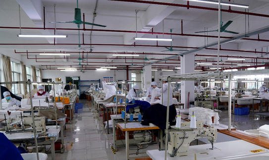 在廣西柳州市白瑩勞保用品有限公司廠區,工人加班加點生產口罩。記者 楊馳 攝