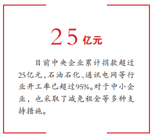 2月18日,國務院聯防聯控機制召開的新聞發布會上,國務院國資委副主任任洪斌介紹,為支援保障疫情防控阻擊戰,目前中央企業累計捐款超過25億元,石油石化、通訊電網等行業開工率已超過95%。對于中小企業,也采取了減免租金等多種支持措施。