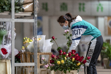 2月26日,當(dāng)?shù)厥忻裨诙纺匣ɑ芙灰资袌鲞x購鮮花。隨著各地花店陸續(xù)開門營業(yè),物流逐漸好轉(zhuǎn),亞洲最大的鮮切花交易市場——昆明斗南花卉交易市場逐步恢復(fù)正常營業(yè)。記者 江文耀 攝
