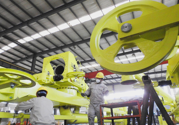 江蘇連云港遠洋流體裝卸設(shè)備有限公司的工人正在加緊安裝一批海外訂購的流體裝卸臂。新華社發(fā)(耿玉和 攝)