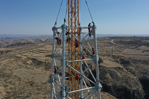 國網工人在蒙西—晉中特高壓交流工程線路工程(內蒙古段)12號鐵塔施工現場作業(無人機照片)。該工程是華北“兩橫三縱”特高壓交流主網架的重要組成部分。記者 徐欽 攝