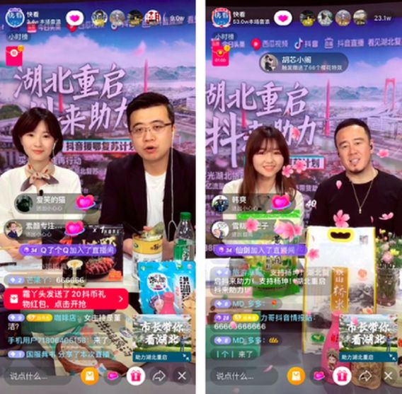 此次湖北5個市州的直播活動,由新華社民族品牌工程“買光湖北貨行動”和抖音“援鄂復蘇計劃”聯合舉辦,恩施州副州長李巖、荊門市市長孫兵、荊州市副市長鄧應軍、黃岡市副市長劉忠誠、十堰市副市長劉運梅參加本次直播。此前,武漢市副市長李強、宜昌市副市長周正英先后參加活動,另有上千名抖音創作者通過直播或短視頻的形式助力推廣湖北特色產品,從4月8日至4月19日,直播活動累計銷售湖北特產156萬件,銷售額達7235萬元