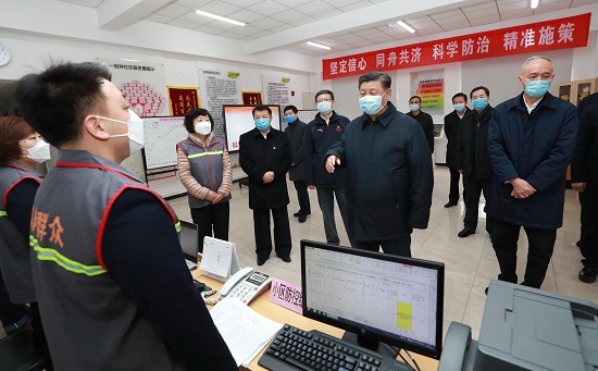 2020年2月10日,中共中央總書記、國家主席、中央軍委主席習(xí)近平在北京調(diào)研指導(dǎo)新冠肺炎疫情防控工作。這是習(xí)近平在朝陽區(qū)安貞街道安華里社區(qū),了解基層一線疫情聯(lián)防聯(lián)控情況。
