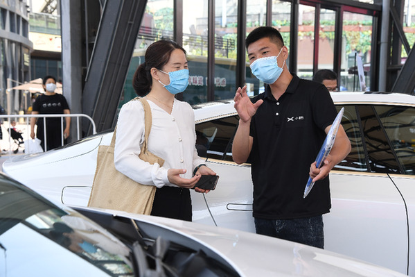 6月6日,在北京華熙LIVE·五棵松商業街區舉辦的“北京消費季之悅動海淀”活動現場,工作人員(右)向市民介紹一款汽車的配置。當日,北京消費季正式開啟,進一步推動北京各行業復商復市,加快實現消費回暖。