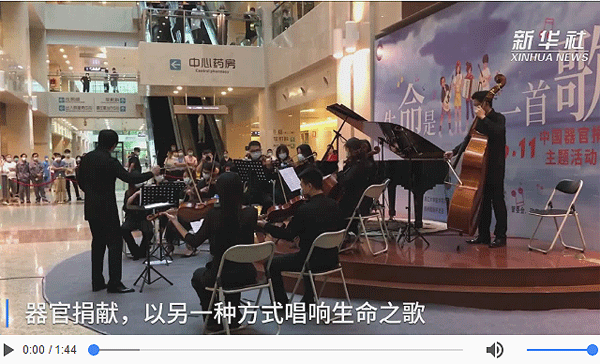 6月11日,由中國器官移植發展基金會發起的“6.11中國器官捐獻主題活動日”首次采用“云音樂節”直播,全國近50個城市的10所高校及110家大型醫院共同參與了線下的公眾宣傳教育活動。在浙江大學醫學院附屬第二醫院門診大廳,開啟了一場特別的交響音樂會表演。器官捐獻,讓生命的旋律得以延續,以另一種方式唱響生命之歌。
