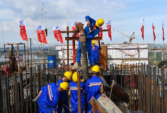 7月18日,中鐵大橋局施工人員在湛江調順跨海大橋西主塔左幅進行封頂混凝土澆筑。當日,由中鐵大橋局承建的湛江調順跨海大橋西主塔左右兩幅成功封頂,該橋東西兩座主塔已全部完成封頂,預計年底合龍。