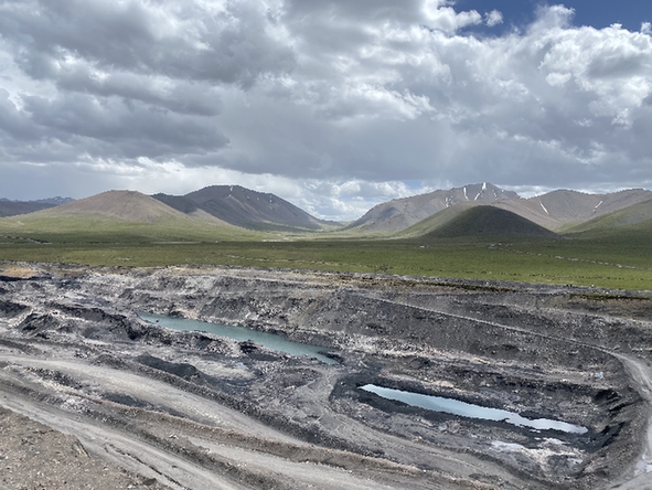 在興青公司露天開(kāi)采現(xiàn)場(chǎng),放眼望去,“開(kāi)膛破肚”式采挖形成的巨型凹陷采場(chǎng),自東南向西北方向蜿蜒5公里,形成一條寬約1公里、深達(dá)300米到500米的溝壑,猶如在高原濕地上劈出的一道巨大傷口。開(kāi)挖剝離出的地下凍土、巖石、煤矸石,在礦坑附近堆起四五十米高的渣山,掩埋了大片草地。