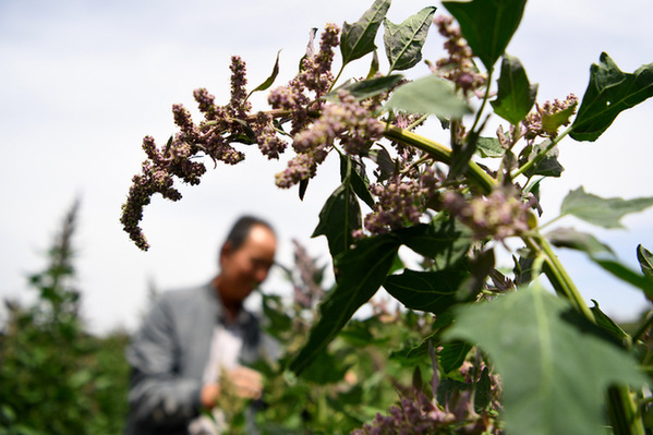 8月2日,天祝藏族自治縣松山鎮大溝興農種養殖專業合作社負責人文玉廷在地里查看藜麥生長情況。記者 陳斌 攝