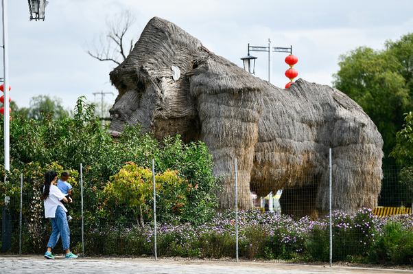 游客在天津市寶坻區黃莊鎮小辛碼頭村里參觀用稻草制作的動物。新華社發(孫凡越 攝)