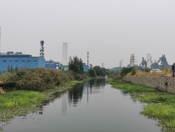 微山湖東南岸岸邊工廠密布,煙囪林立。(記者 邵琨 攝)