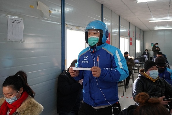 今年35歲的張衛鵬是餓了么平臺的一名外賣騎手,和他一起接種的還有幾十位同樣留在北京過春節的騎手同事。
