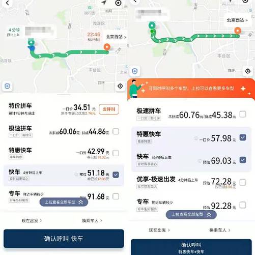 ——記者在某網約車平臺上搜索發現,在同一時間于同一地點出發至北京西站,經常使用該網約車平臺的用戶手機內顯示的快車打車費用預估為69.03元。但不經常使用該平臺的用戶手機上顯示,打車費用預計為51.18元,其中包含了17.05元被抵扣的優惠券。但記者發現,即便不選擇使用優惠券抵扣車費,不經常使用該平臺的用戶打車費用是68.23元,比常用用戶顯示的車費還便宜0.8元。