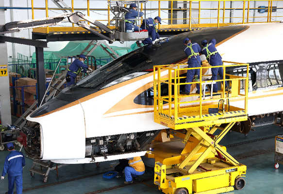 2月28日,技術(shù)人員對高鐵列車的車頭單元進(jìn)行檢修。