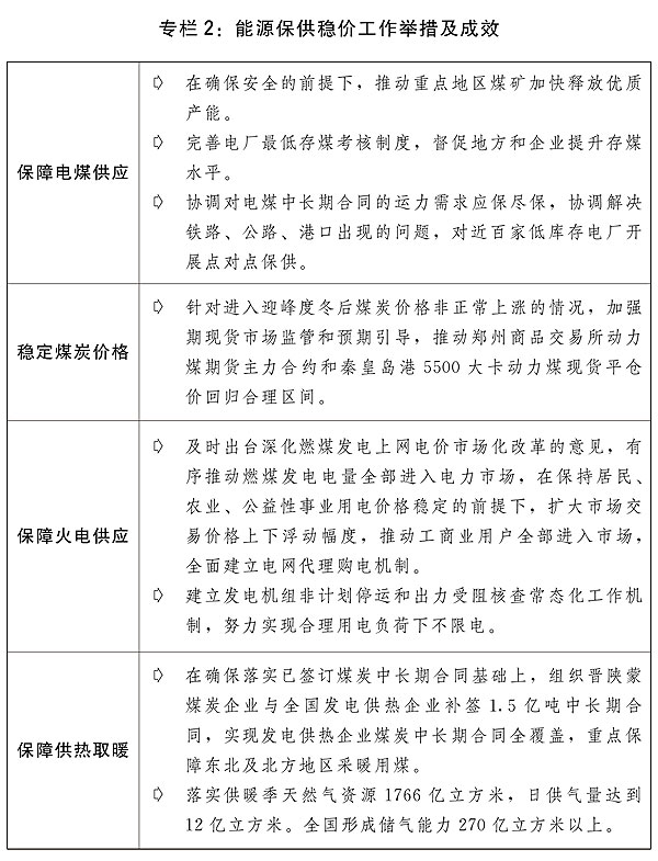 同時,統籌高效做好煤電油氣運調節。充分發揮煤電油氣運保障工作部際協調機制作用,壓實地方政府、部門、企業責任,堅持先立后破、民生優先,確保能源安全供應。增強國內資源生產保障能力,加快油氣、礦產等資源勘探開發,鞏固發展增儲上產良好勢頭。保障電煤供應,加大重點產煤地區和運力緊張地區的電煤運輸保障,完善煤炭市場價格形成機制,提升電力保障能力,確保穩定可靠充足供應,完善新能源上網電價機制,提高天然氣氣源保障水平。有序推進能源結構調整優化。實施全面節約戰略,加強精細化用能管理,確保民生和公共用能需求,推動能效低于基準水平的重點行業企業有序實施改造升級,推動全社會加強節約用電用能。完善國家戰略物資儲備制度。
