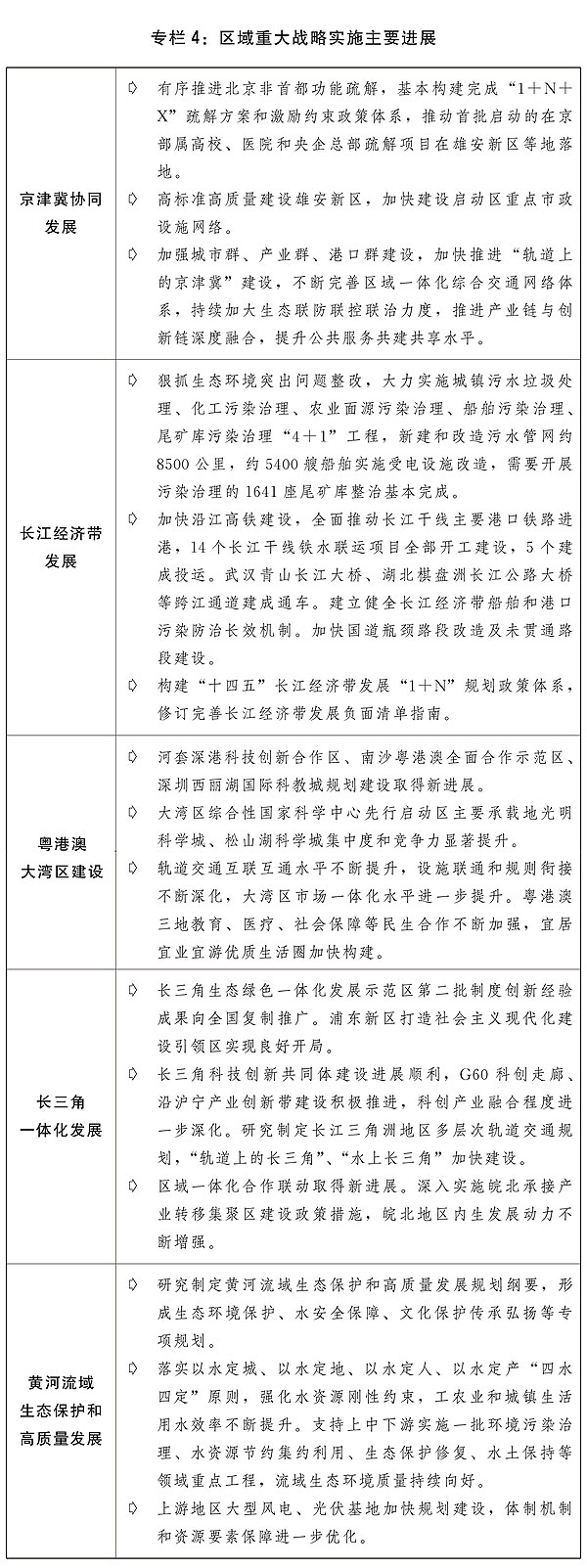 一是深入實施區域重大戰略。有力推動京津冀協同發展,高標準高質量建設雄安新區,穩妥有序推進率先啟動的疏解項目在雄安新區落地,落實支持北京城市副中心高質量發展的意見,加快天津港北方國際航運樞紐建設。扎實推動長江經濟帶高質量發展,深入推進污染治理“4+1”工程,持續鞏固長江禁捕和退捕漁民安置保障工作成果,積極構建生態產品價值實現機制政策制度體系,建立長江流域協調機制和水生態考核機制,完善綜合交通運輸體系,力爭全線開工建設沿江高鐵,大力發展多式聯運。積極穩妥推進粵港澳大灣區建設,堅持基礎設施“硬聯通”和規則機制“軟聯通”并舉,加快推進大灣區市場一體化進程。加快推進橫琴粵澳深度合作區高質量發展,支持前海深港現代服務業合作區改革開放。深化通關模式改革,落實落細教育、醫療、養老、交通等領域政策,進一步便利港澳居民在大灣區內地學習工作生活。提升長三角一體化發展水平,深入推進基礎設施公共服務等重點領域一體化發展,穩步推進長三角生態綠色一體化發展示范區、皖北承接產業轉移集聚區等重點區域建設,推動科創產業深度融合,積極穩妥推動港航資源整合。扎實推進黃河流域生態保護和高質量發展,嚴控高耗水作物種植面積,大力推進沿黃河大中型灌區現代化改造,緊抓環境污染“3+1”綜合治理,加快中游地區水土流失綜合治理,加快補齊城鎮污水收集管網和處理設施短板,推進尾礦庫環境風險隱患排查整治,加強沿黃通道建設,推動建設寧夏黃河流域生態保護和高質量發展先行區。