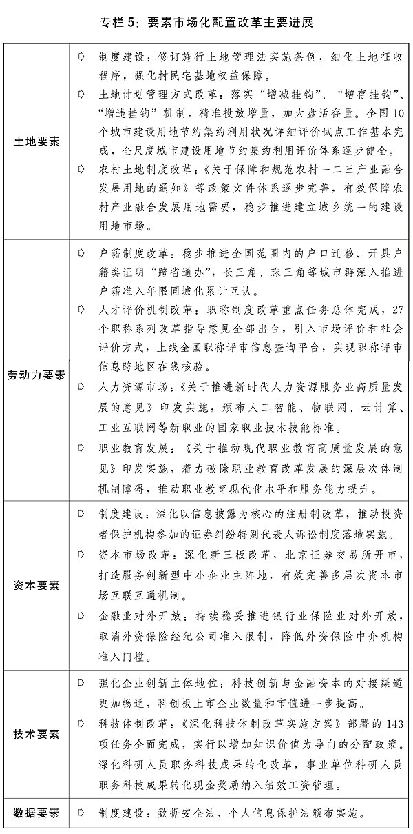 二是各類市場主體活力進一步激發。深入實施國企改革三年行動方案,加快國有經濟布局優化和結構調整,國有經濟進一步聚焦戰略安全、產業引領、國計民生、公共服務等功能。國有企業混合所有制改革積極穩妥推進,近100戶試點企業完成主體改革任務。持續為民營企業改革發展營造良好環境,20多部涉產權法律法規立改廢,5847件涉產權規章規范性文件被清理。民營企業進入油氣進出口、鐵路、核電等領域,首條民間資本控股的杭紹臺高鐵建成通車。總結8個地方72條支持民營企業改革發展的典型做法并向全國推廣,充分發揮示范引領作用。充分發揮各級融資信用服務平臺作用,加強信用信息共享應用促進中小微企業融資。