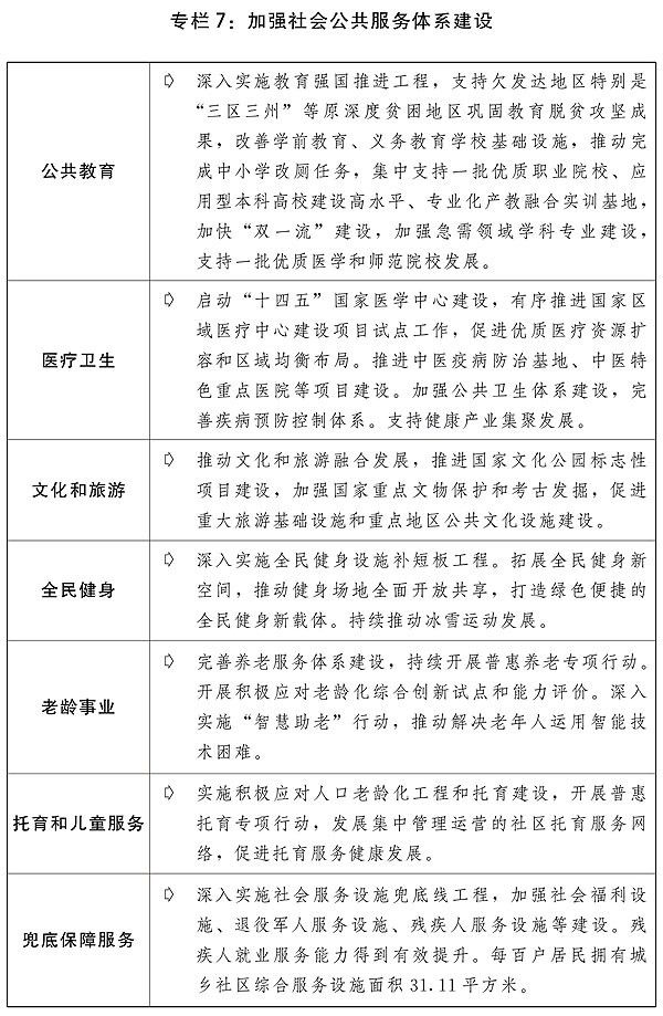 四是完善公共服務政策制度體系。分類推進基本公共服務均等化發展,推動服務重心向基層下沉,增加普惠性非基本公共服務供給。支持社會力量增加普惠性托育服務供給,進一步完善學前教育收費政策,推進普惠性學前教育資源擴容增效,推進兒童友好城市建設。推動義務教育優質均衡發展和城鄉一體化,提升農村學校辦學能力,依據常住人口規模增加城鎮教育資源。繼續做好義務教育階段減負工作。加強縣域普通高中建設。改善職業教育辦學條件。推進高校“雙一流”建設,加快經濟社會發展重點領域急需學科專業建設、人才培養和科技攻關,完善產教融合政策措施。支持中西部高等教育發展,高校招生繼續加大對中西部和農村地區傾斜力度。加強教師隊伍建設,加大中西部地區教師培訓力度。辦好特殊教育、繼續教育,規范民辦教育發展。完善三孩生育政策配套措施,將3歲以下嬰幼兒照護費用納入個人所得稅專項附加扣除,推動生育支持政策落地見效。貫徹落實積極應對人口老齡化國家戰略,加強養老托育服務體系和健康支撐體系建設,維護好老年人合法權益。推動公立醫院高質量發展,加快健全現代醫院管理制度,深入推進國家醫學中心、國家區域醫療中心建設項目和縣級醫院建設,加快完善分級診療體系,深化醫療服務價格、醫保支付管理和公立醫院薪酬制度改革。補齊婦幼兒科、精神衛生、老年醫學等服務短板。持續深入開展愛國衛生運動、推進實施健康中國行動,倡導文明健康綠色環保生活方式。實施現代化疾控體系建設、國家重大傳染病防治基地建設等工程,提升公共衛生防控救治能力。加快中醫藥特色發展。推動中華優秀傳統文化創造性轉化和創新性發展,促進出版、電影、廣播電視、文物等事業高質量發展,推進公共文化數字化建設,提供更多公共文化產品。加強國家重大文化項目和國家文化公園建設,加強重要文化遺產和國家公園等重要自然遺產保護設施建設,全面提升革命文物保護利用水平,促進公共文化服務提質升級。推進國民旅游休閑加快發展,不斷完善節假日制度。實施全民健身設施補短板工程,加強體育公園等全民健身場地設施建設。深化公共法律服務體系建設。