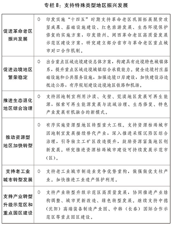 二是提高區域協調發展水平。推動西部大開發形成新格局,發揮風、光、水電和礦產資源優勢建設大型清潔能源基地。積極發展文化和旅游產業。實施重要生態系統保護和修復工程,加快重大項目規劃建設。推進貴州大數據綜合試驗區建設。積極穩妥推進雅魯藏布江下游水電開發等重大工程。推動東北振興取得新突破,組織實施好東北全面振興“十四五”實施方案,繼續推進黑瞎子島中俄國際合作示范區建設,積極推動大小興安嶺林區生態保護與經濟轉型,穩步推進長吉圖開發開放先導區發展,推動《東北振興重點項目三年滾動實施方案》重點項目加快建設。推動中部地區高質量發展,推動湘鄂贛協同高質量發展,支持晉陜豫黃河金三角承接產業轉移示范區建設,支持山西進一步深化能源革命綜合改革試點,推進淮海合作區協同發展,支持中國(武漢)光谷建設,編制出臺洞庭湖生態經濟區規劃。鼓勵東部加快高質量發展,支持福建高質量發展及平潭綜合實驗區建設,推動山東新舊動能轉換綜合試驗區建設取得新進展。支持民族地區改善生產生活條件,加強各民族交流交往交融,鑄牢中華民族共同體意識。推動革命老區、邊境地區、生態退化地區、資源型地區、老工業城市等特殊類型地區振興發展,推進國家級新區、臨空經濟示范區、承接產業轉移示范區等功能平臺建設,推動國家自主創新示范區和高新區高質量發展。支持海洋經濟發展示范區、現代海洋城市等建設,提升海洋資源開發利用水平。