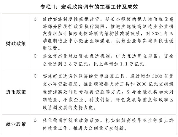 (二)創新和完善宏觀調控,經濟基本盤進一步鞏固。加快構建新發展格局,加強宏觀政策跨周期調節,做好保供穩價工作,加大助企紓困力度,實現了較高增長和較低通脹的優化組合,經濟保持較好發展態勢。