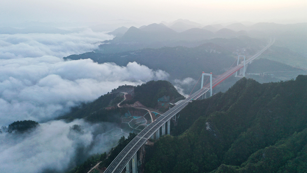 3月28日拍攝的晨霧中的貴黃高速公路陽寶山特大橋和石頭寨特大橋(無人機照片)。
