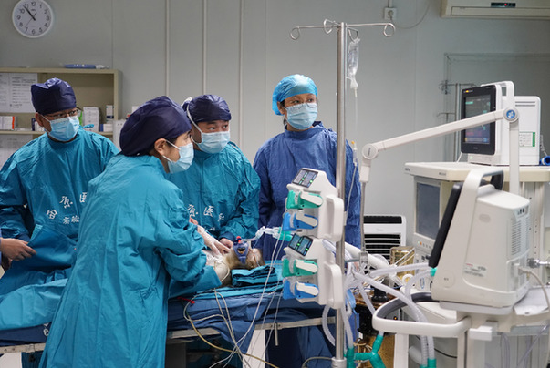空軍軍醫大學西京醫院成功實施多基因編輯豬-恒河猴異種肝、心、腎器官移植。2020年6月29日,醫護人員在病房內查看移植肝受體猴的體征。新華社記者 邵瑞 攝