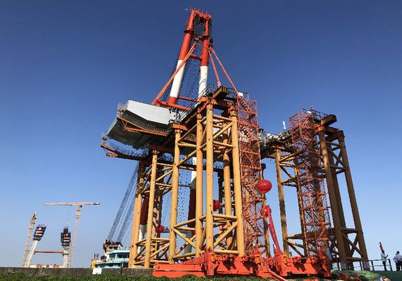 4月10日拍攝的南中高速洪奇門特大橋主橋吊裝架設首片鋼箱梁施工現場。
