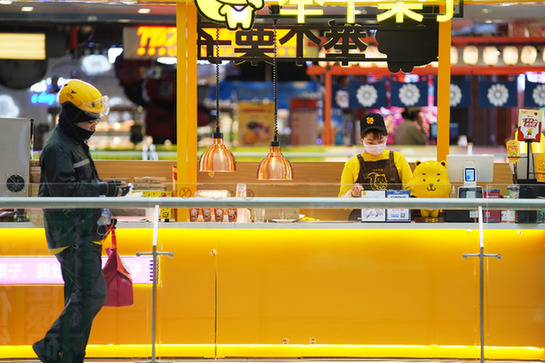 4月11日,在哈爾濱市香坊區一商業廣場內,一名外賣送餐員準備離開餐飲區送餐。