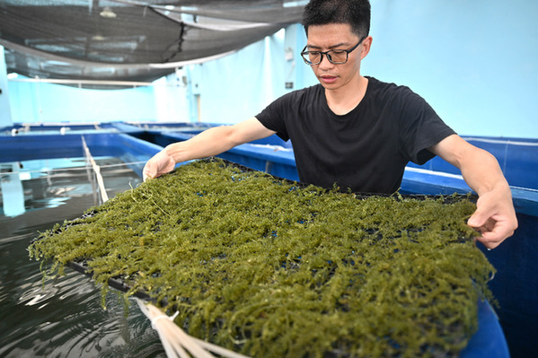 5月31日,工作人員在文昌馮家灣現代化漁業產業園養殖示范廠房里查看海葡萄生長情況。新華社記者 郭程 攝