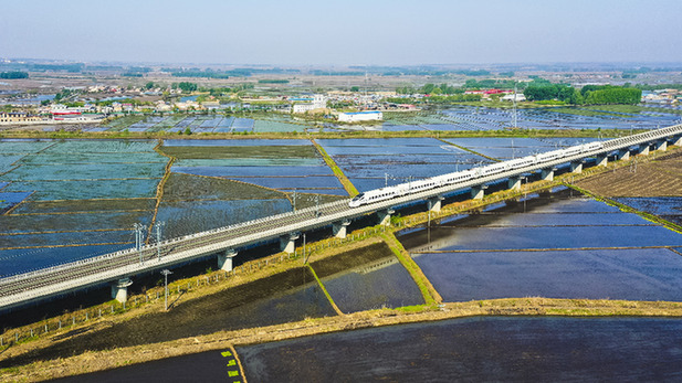 在哈牡高鐵線上,一列動車組列車正從稻田間駛過。資料照片