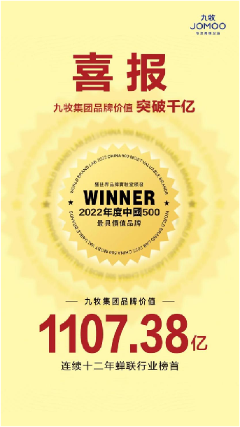 7月26日,由世界品牌實(shí)驗(yàn)室(World Brand Lab)主辦的(第十九屆)“世界品牌大會(huì)”在北京舉行,大會(huì)公布了2022年《中國(guó)500最具價(jià)值品牌》分析報(bào)告,九牧集團(tuán)各品牌與國(guó)家電網(wǎng)、海爾、騰訊、華為等品牌一同上榜中國(guó)500最具價(jià)值品牌,并以1107.38億的品牌價(jià)值領(lǐng)跑中國(guó)衛(wèi)浴,連續(xù)12年蟬聯(lián)行業(yè)第一,行業(yè)首家品牌價(jià)值突破千億。