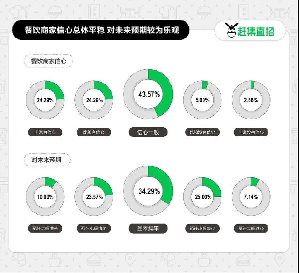 不難看出,在消費需求的帶動下,餐飲商家收入仍具有較大發(fā)展空間,從業(yè)者普遍持樂觀情緒。趕集直招數(shù)據(jù)顯示,近五成餐飲業(yè)受訪者表示對2022年餐飲消費發(fā)展有信心,67.86%的餐飲業(yè)受訪者認為2022年餐飲消費可以基本持平或呈現(xiàn)增長趨勢,其中有33.57%的受訪者認為2022年餐飲消費會出現(xiàn)增長。