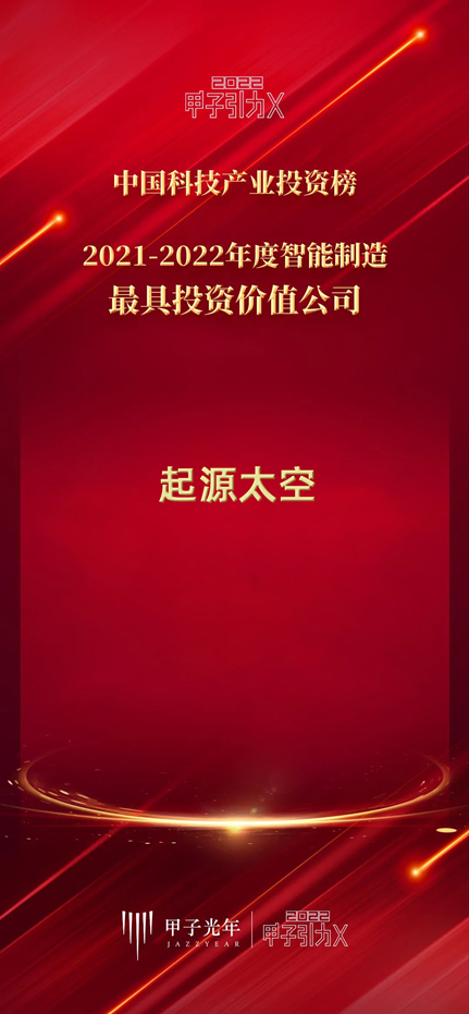 在本次峰會上,起源太空成功入選「甲子光年」“2021-2022年度智能制造最具投資價值公司”榜單。「甲子光年」表示,2022年,守在各個賽道的產業資本異?;钴S,大跨步踏入創投圈。此消彼長間,風云變幻的創投江湖緩緩駛入了硬科技投資的新時代。前期“十分耕耘、一分回報”,硬科技投資注定是一場長期主義實踐。作為領先的中國科技產業智庫,「甲子光年」持續關注著可真正促進科技進步與產業發展的投資機構與科創企業,秉持客觀公正的態度,采用科學完備的數據處理分析方法,通過公平公正的評選標準,輸出2021-2022年度科技產業投資機構與科創企業明星榜單。