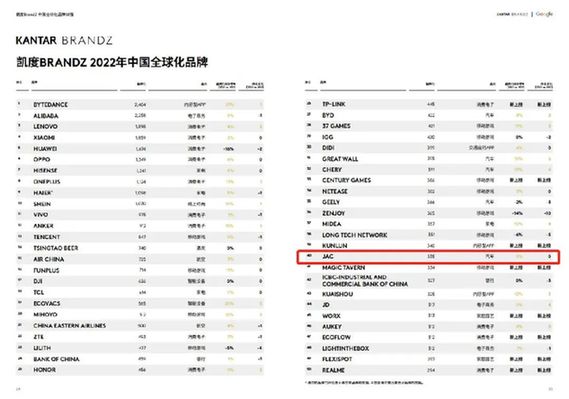 近日,全球知名品牌排行榜凱度BrandZ攜手谷歌發布了《BrandZ中國全球化品牌》研究報告,揭曉2022年全球化品牌50強及成長明星榜單,江汽集團位列中國全球化品牌第40位,中國汽車品牌第5位,品牌力成長率較2021年增長3%。這是繼2021年作為新晉品牌首次上榜之后,江汽集團再一次榮登該權威榜單,展現了持續、強勁的品牌增長勢頭。