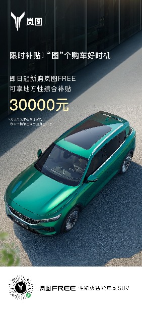 限時補貼來襲。2022年8月1日起,在湖北省開票下定嵐圖FREE,可享地方政府綜合性現(xiàn)金補貼30000元。額度有限,先到先得。(推廣)