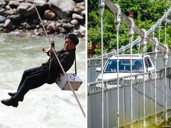 拼版照片:左圖為2011年2月20日,“溜索醫生”鄧前堆在怒江州福貢縣石月亮鄉拉馬底村溜索到江對岸出診(新華社記者秦晴攝)。右圖為2022年9月14日,鄧前堆出診歸來駕駛私家車過橋(新華社記者江文耀攝)。