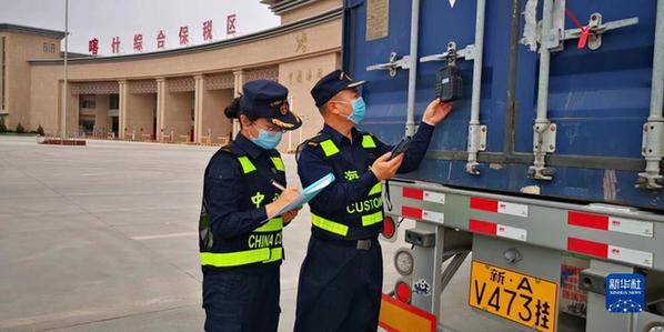 海關(guān)現(xiàn)場(chǎng)關(guān)員在喀什綜合保稅區(qū)登記入?yún)^(qū)車輛電子鎖信息(2022年9月14日攝)。新華社發(fā)(圖爾罕·麥麥提伊敏 攝)