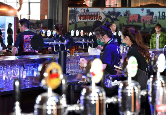在“青啤時光海岸精釀花園”餐廳,工作人員為顧客打啤酒。記者 李紫恒 攝
