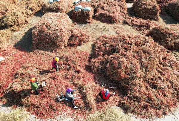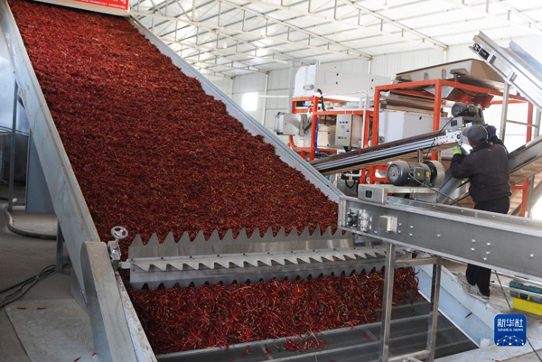工人在白腦包鎮辣椒產業示范園初選辣椒。(新華社記者李云平 攝)
