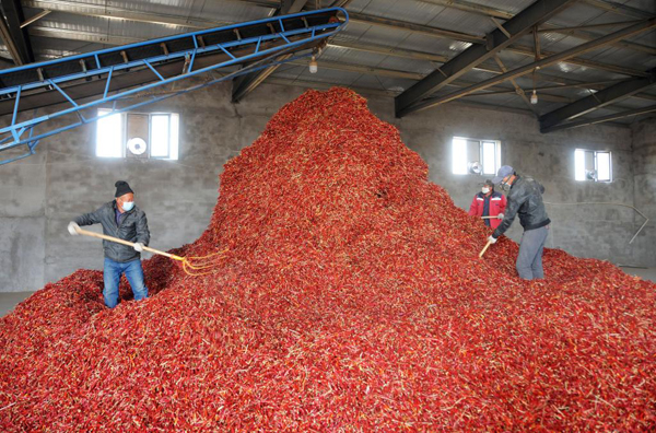 工人在白腦包鎮辣椒加工廠粗加工辣椒。(新華社記者李云平 攝)
