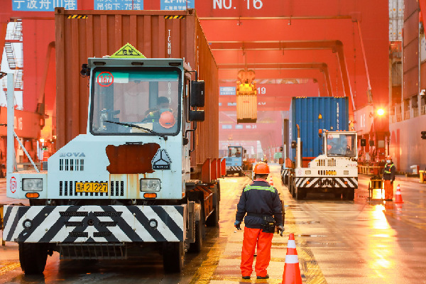 浙江寧波舟山港梅山港區橋吊在緊張作業。