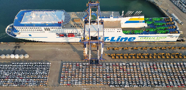 出口商品車在山東港口煙臺港集結裝船(無人機照片)。