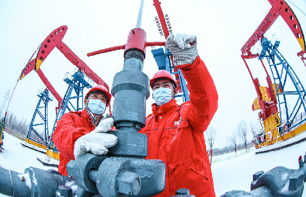 大慶油田第一采油廠員工在保障油井冬季安全生產(chǎn)。