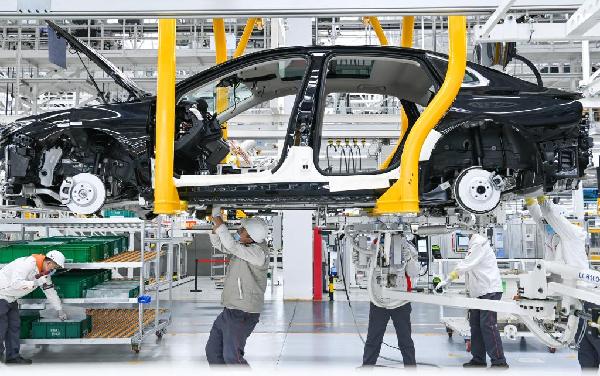 在吉林省長春市中國第一汽車集團有限公司紅旗繁榮工廠,工人在總裝車間的生產線上裝配車輛(2022年10月17日攝)。新華社記者 顏麟蘊 攝