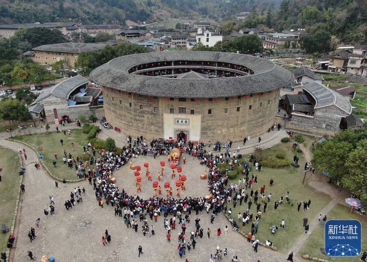 ↑1月25日,游客在福建省龍巖市永定區土樓景區觀看民俗表演(無人機照片) 。新華社發(周楊東 攝)