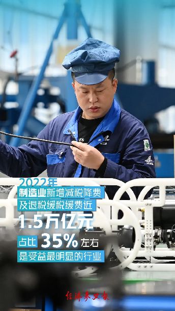 一是以“真金白銀”有效緩解了企業(yè)經(jīng)營壓力。稅務(wù)總局對10萬戶重點稅源企業(yè)調(diào)查顯示,2022年企業(yè)每百元營業(yè)收入稅費負擔(dān)下降2.7%,其中受疫情影響較大的交通運輸業(yè)、住宿餐飲業(yè)分別下降15.4%和14.2%,負擔(dān)顯著減輕。