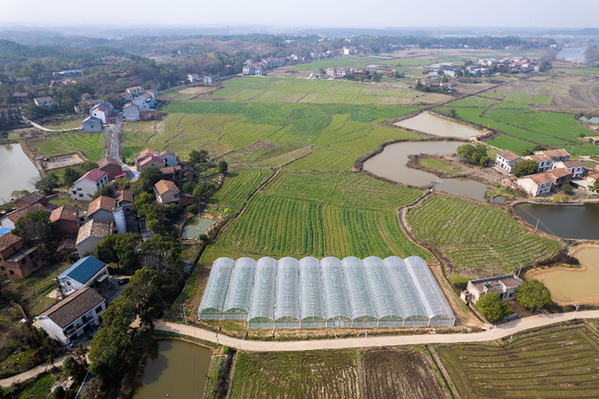 這是2月21日在醴陵市沈潭鎮江田村拍攝的一處新修建的育秧大棚(無人機照片)。